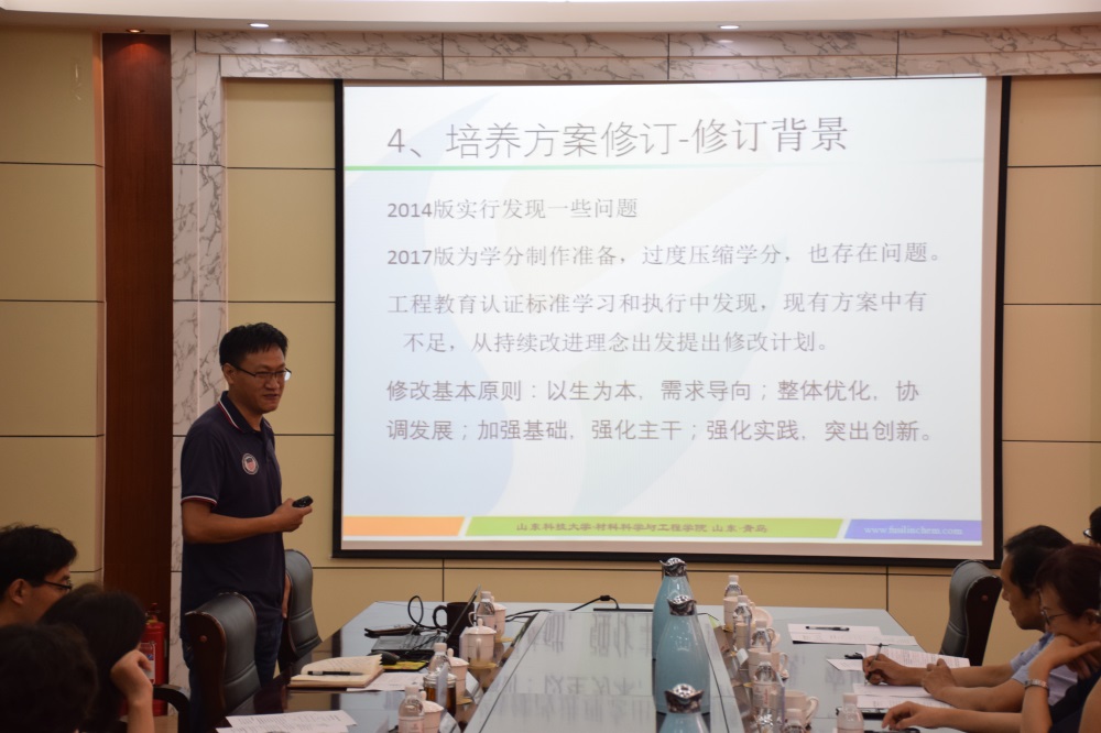 2019年7月6日上午,买球官网2018版高分子材料与工程专业培养方案修订论证会议在J2-434会议室召开。青岛大学研究生院院长丛海林、中国海洋大学买球官网副院长张玥、青岛科技大学高分子材料与工程学院副院长杜爱华、青岛大学郭霖教授、齐鲁石化研究院院长李文义、青岛海湾化学研究院梁军部长、双星轮胎集团人力资源部经理刘正先参加论证会。学院党委书记申兆亮、院长崔洪芝、副院长李敏、高分子与材料化学系全体老师、无机非金属材料系、金属材料系、实验中心部分老师参加会议。