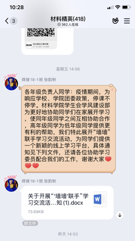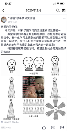“墙墙”联手学习交流活动。随着线上课程学习的不断深入,同学们也开始遇到各种学习上的问题。为促进同学们之间的互动交流,帮助同学们解答疑惑,学生会创建了“买球官网交流学习墙”公众号,每天收集、整理并发布课程相关的各类问题,鼓励同学们通过评论区留言的方式进行交流互动,并邀请专业课老师、高年级同学参与答疑解惑,以此帮助同学们解决问题、拓展思路。