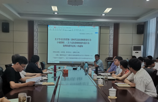 申兆亮结合《新时代师德规范》、《新时代高校教师职业行为十项准则》、《关于高校教师师德失范行为处理的指导意见》《买球官方网站教师师德考核办法》等师德师风建设相关文件对全体教职工进行宣讲,重点从思想政治方面、学术道德方面、教育教学方面、生活行为方面、廉洁自律方面等讲解了买球官方网站师德负面清单,并结合违反高校教师职业行为十项准则典型案例对师德失范行为处理进行了深入剖析。