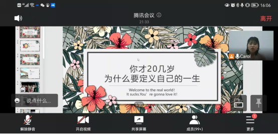 3月24日下午,买球官网举办第40期校友论坛,学院2018届材料化学专业毕业生王洁以“你才20几岁,为什么要定义自己的一生”为题进行交流分享。本次论坛通过腾讯会议线上进行,学院学工办主任/团委书记马韶霞、辅导员薄艳艳和部分本科生、研究生参加。