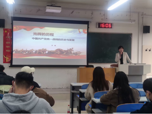 11月3日下午,艺术学院党委副书记兼副院长卫雪以《光辉的历程》为题,以时间顺序分别从建党初期和大革命时期的民主联合战线、土地革命时期的工农民主统一战线、抗日战争时期的抗日民族统一战线、解放战争时期的人民民主统一战线及新时期爱国统一战线介绍党的统一战线的发展历史。