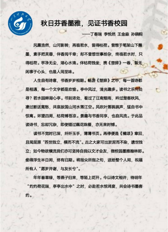 “最是书香能致远,读书之乐乐无穷”,参赛选手以团队或个人形式,自行选择在若水园、砚湖、名人园等校园各个景点进行读书打卡,并适时总结交流分享读书心得。秋日校园内,嵙嵙学子们相伴而读,分享纸墨中蕴藏的大千世界,在目光所及皆是黄金的清秋,书香与山科撞了个满怀。每一个参赛成员都在惬意的校园读书环境中寻找着成长的乐趣,随之也让读书之风吹向了校园每个角落。