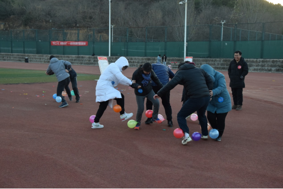 竞赛活动包含两部分内容,一是党的二十大精神知识竞答,二是趣味竞赛活动,其中包括举步维艰、你投我接、众人大跳绳、投弹打靶、篮球罚球、三人四足接力跑、运粮食和智勇大比拼八个竞赛项目。活动中,老师们随机组成参赛队伍,秉承着“友谊第一、比赛第二”的体育精神,全身心投入到活动中,队员之间互相加油打气,现场氛围热烈,欢声不断。在现场服务的学生会素质拓展部的工作人员也被老师们的热情感染,李洪旭同学说到:“在活动中看到了老师们的另一面,被他们团结协作认真比赛的热情鼓舞,听到老师们爽朗的笑声都不觉得天气寒冷了”。