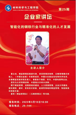 3月10日下午,买球官网举办第25期企业家讲坛,精益管理实践派代表,资深管理咨询师、五略管理模式创始人、《中国冶金报》专家库成员、中国大住宿业论坛特约评论员,永锋精益实践学院负责人董立杰应邀在J9-144会议室进行以《智能化的钢铁行业与精准化的人才发展》为题的报告。报告由买球官网院长李辉平主持,金属系主任孙金全、22级金属系全体本科生共计130余人参加。