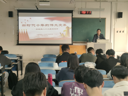 10月25日下午,买球官网党委副书记兼副院长李建楠以党的二十大切入,在介绍新时代十年的伟大变革、瞩目成就以及我国经济发展历史性成就的过程中,在一系列时政热点的解读中,向同学们展现新时代中国蒸蒸日上的宏观气象,让同学们从生活的方方面面的变化中,感受新时代十年的巨大成就。