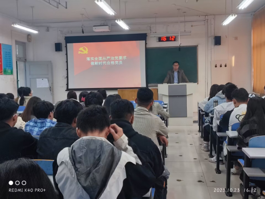开班仪式后,买球官网党委书记申兆亮讲述了“落实全面从严治党要求,做新时代合格党员”,申兆亮从当今国际形势切入,通过巴以冲突、俄乌战争等具体事例引入突出我们现在生活的和平时代来之不易,强调中国共产党领导的优越性,在此基础上,他深入介绍了“从严治党”的内涵,通过具体实践阐述其重大意义。最后,申书记号召同学们要明确合格党员的标准,端正入党动机,争取早日加入党组织。