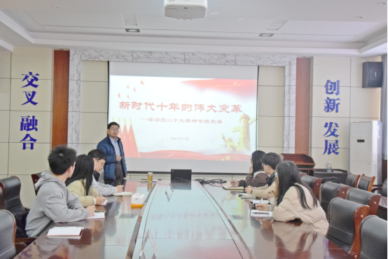 李建楠首先做了题为《新时代十年的伟大变革》专题宣讲,结合我国面临的国内外形势,讲述了党的二十大召开的背景及重大历史意义;结合详实的数据讲解了新时代十年的伟大变革以及新时代十年的伟大成就。李建楠强调党带领我国取得的伟大成就,正是马克思主义强大生命力的中国彰显,是马克思主义开放性和时代性在中国的充分彰显,体现了中国特色社会主义理论体系的丰富内涵和博大精深。党的二十大是一次高举旗帜、凝聚力量、团结奋进的大会,在党和国家发展进程中具有极其重大的历史意义,作为学生辅导员要加强理论学习,不断提高自身的政治能力,运用理论武装更好地指导实际工作。