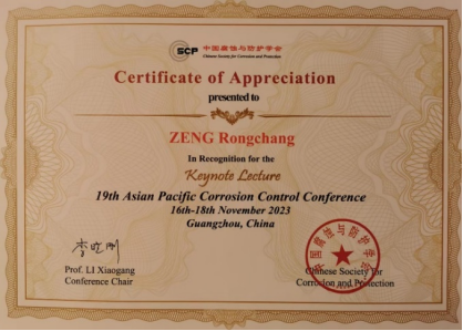 第19届亚太腐蚀控制会议(19th APCCC)于2023年11月16-18日在广州成功举行。会议围绕材料腐蚀与防护领域的多个关键问题进行了深入交流,为推动新材料技术的全球化应用推广提供了关键支持。中国腐蚀与防护学会常务理事、中国腐蚀与防护学会医用金属材料腐蚀控制专业委员会首任主委,我校买球官方网站二级教授曾荣昌应邀参加本次会议并做主题报告(keynote lecture),同与会海内外专家进行了学术交流和讨论。