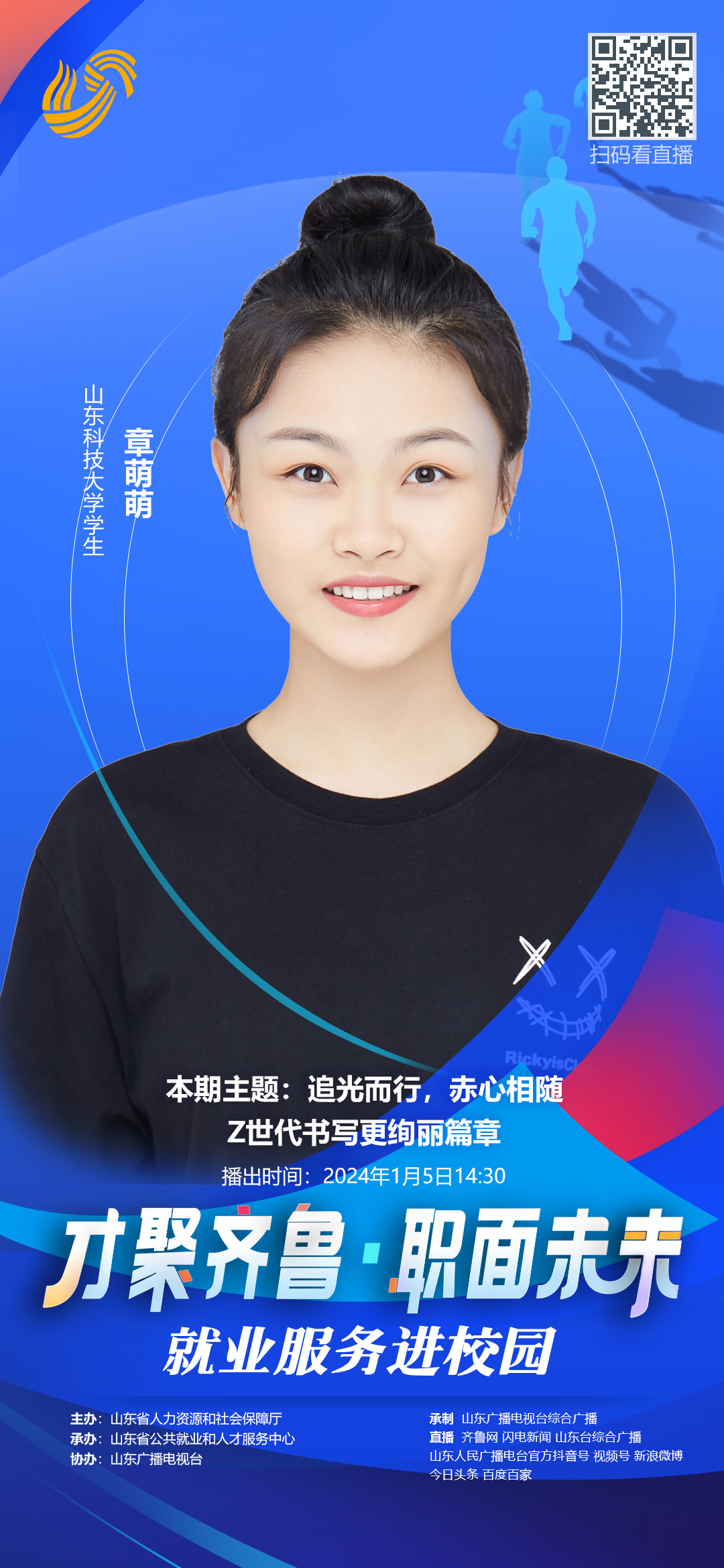 由山东省人力资源和社会保障厅主办、山东省公共就业和人才服务中心承办、山东广播电视台协办的“才聚齐鲁•职面未来”公益就业指导直播课将于1月5日14:30播出。买球官网新能源材料与器件专业2024届毕业生章萌萌受邀做客直播间,进行“追光而行,赤心相随——Z世代书写更绚丽篇章”主题分享。这次直播课将深入探讨在职场中面临的挑战,以及如何勇敢迎接未知。章萌萌将分享她和身边朋友们在求职、成长过程中的心得,与您共同思考在竞争激烈的现实中如何闪耀光芒,书写自己的职业传奇。