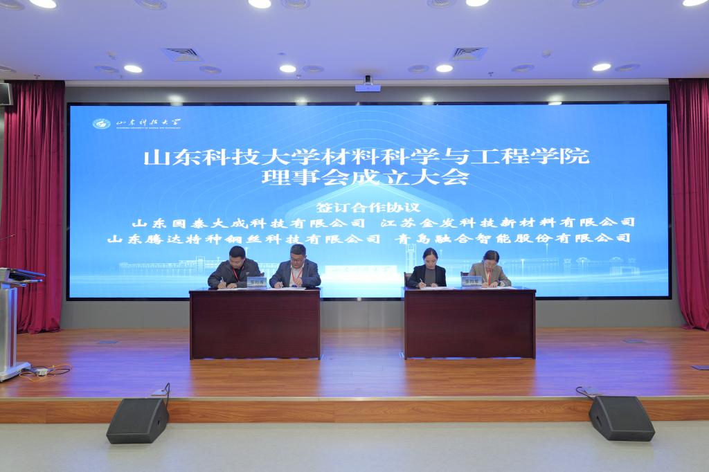 会议审议通过了《买球官方网站买球官网理事会章程(草案)》、《买球官方网站买球官网第一届理事会组成单位名单》,表决通过理事长单位、副理事长和理事单位。随后诸葛福民向副理事长单位道恩集团有限公司、浦林成山(山东)轮胎有限公司、豪迈集团股份有限公司、山东国瓷功能材料股份有限公司授牌;王晓东、申兆亮向理事单位富奥威泰克汽车底盘系统青岛有限公司、青岛浩瀚全材半导体有限公司、江花集团有限公司、山东格物光电科技有限公司、青岛融合新材料股份有限公司、青岛颐科橡塑有限公司授牌。宋强、韩永芹代表买球官网与山东国泰大成科技有限公司、江苏金发科技新材料有限公司、山东腾达特种钢丝科技有限公司、青岛融合智能科技有限公司签订合作协议。刘松向研究生联合培养基地中国科学院兰州化学物理研究所青岛研究中心、中国科学院青岛生物能源与过程研究所颁牌。朱景星、刘勇为共建合作基地单位青岛丰东热处理有限公司、中石化第十建设有限公司、泰开集团有限公司、青岛西姆耐磨材料科技有限公司、青岛融合光电科技股份有限公司、青岛圣戈班玻璃有限公司颁牌。