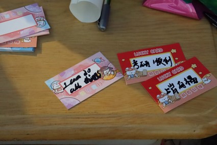 此次活动形式分为四个部分。第一部分是刮刮卡制作,同学们在刮刮卡上写满祝福语句,贴上图层贴纸送给考研学子。第二部分是气球花打气及包装,同学们把气球充气,对充气后的气球花进行包装。第三部分为制作不织布挂件,同学们利用不织布,剪刀,胶水等工具,动手制作有关考研祝福语的挂件。第四部分是礼品包装,各部门将共同对刮刮卡和礼物进行包装。