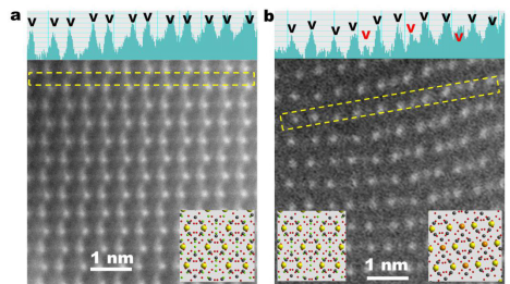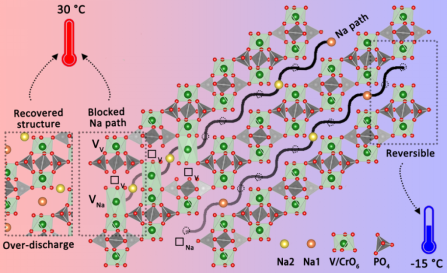 基于该异常现象,刘瑞在买球官网“青创团队”的支持下开展了深入的研究。结合宽温区原位XRD、非原位X-射线吸收谱、软X-射线吸收谱、球差校正扫描透射电子显微镜等表征手段,首次发现该异常现象源自NVCP中过渡金属离子V的迁移,进而导致材料结构的劣化。电池在常温循环过程中V会迁移到Na位,导致Na扩散路径的堵塞进和“诱导效应”的弱化,从而导致电池性能的衰退。在这一认识的指导下,进一步提出了过度嵌Na(即低压放电)有望促使V离子迁回原位。这一设想得到了电化学测试和多种原位/非原位表征的验证。