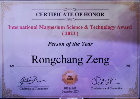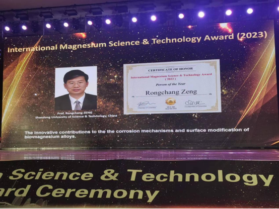 2023年12月11日-12日,2023年度国际镁科学技术奖颁奖典礼暨《镁合金学报(英文)》创刊十周年前沿论坛在河南省鹤壁市顺利召开。本次颁奖典礼由国际镁学会(International Mg Society)和《镁合金学报(英文)》(Journal of Magnesium and Alloys)共同主办。买球官网曾荣昌教授受邀参加此次颁奖典礼并获得2023年度人物奖。同时获得该奖项的还有美国加州大学圣巴巴拉分校机械工程学院Irene J. Beyerlein教授、河北工业大学副校长王慧远教授和德国亥姆霍兹Hereon研究中心表面科学研究所所长Mikhail Zheludkevich教授。此奖的获得是组委会对曾荣昌教授在医用镁合金腐蚀机制和表面改性领域相关工作的高度认可。