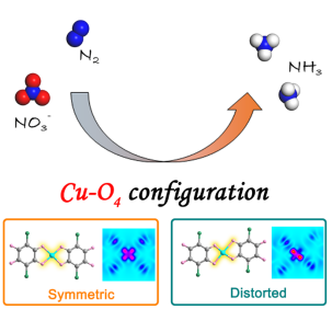 单原子催化剂由于近乎100%的原子利用率和极高的稳定性在催化领域受到了广泛关注。一直以来对称型的M-X4 (M = Fe, Co, Cu;X= C, N, O)构型被认为是理想的单原子催化剂结构。然而,近期部分理论研究结果表明这种对称的电子分布状态可能不利于部分中间产物的活化,从而影响其催化活性。鉴于此,研究团队通过利用配位聚合物材料结构高度可调的特点,以氯冉酸分子(CA)为构筑单元与Cu配位,形成了富含Cu-O4构型的链状结构。由于相邻链的Cl与Cu之间存在较强的相互作用,使得Cu-O4构型发生了显著的局域结构畸变。进一步的理论计算结果表明,这种畸变的Cu-O4构型可以显著降低氮还原反应(NRR)和硝酸根还原反应(NO3RR)过程中中间产物的(*N2*NO)的吸附与活化能垒,从而显著提升其催化性能。与此对应的,在相邻链之间植入辅助配体(吡嗪)会削弱Cu-O4构型的畸变程度,从而降低其催化活性。这种通过引入局域畸变调节活性中心电子构型的策略,可以为高效电催化剂的设计合成提供新的途径。