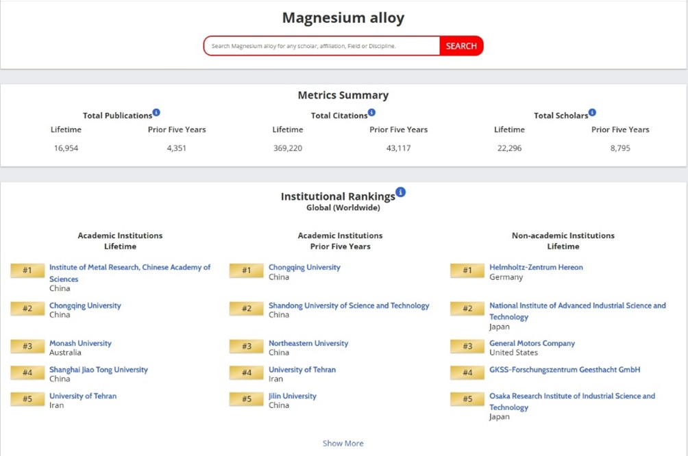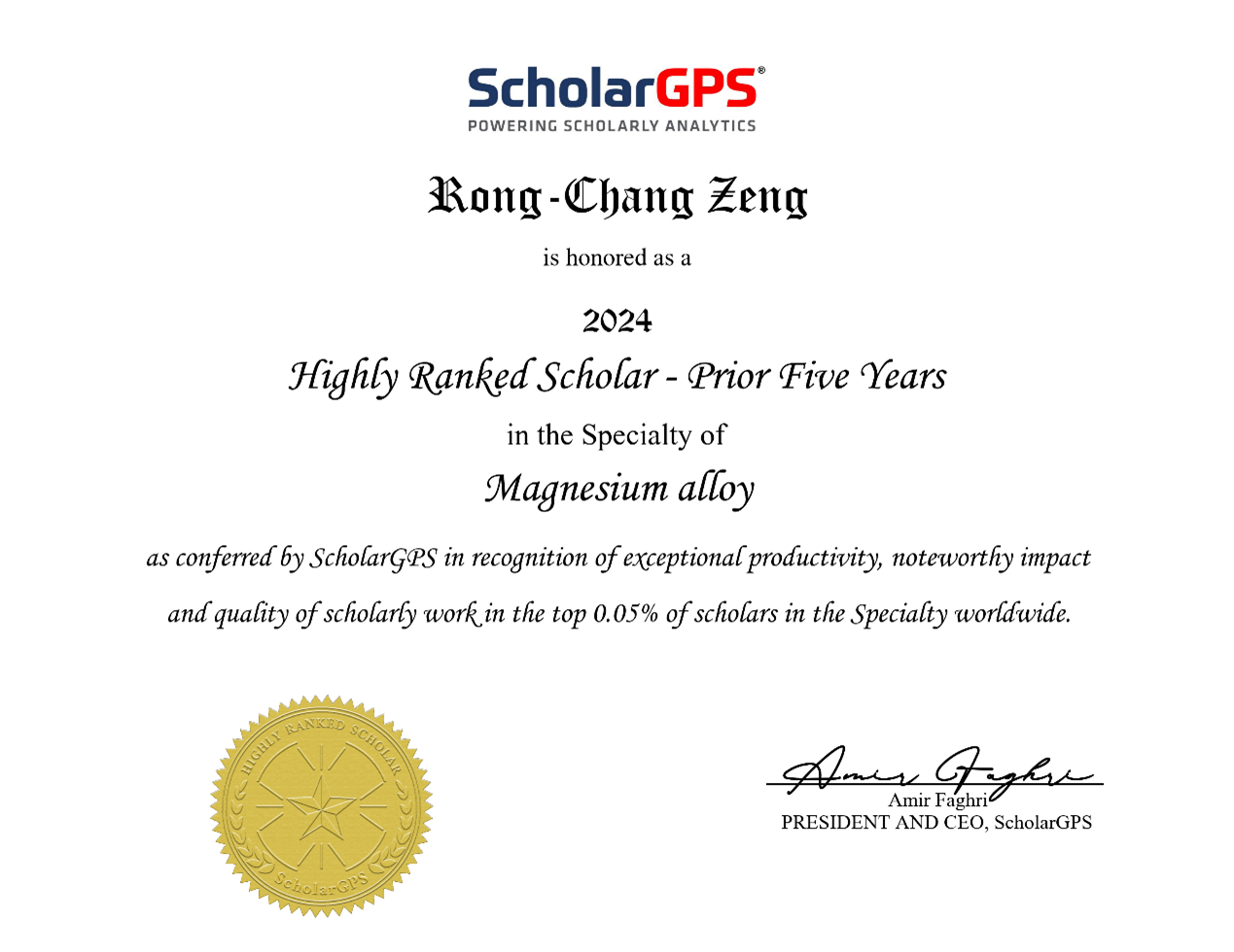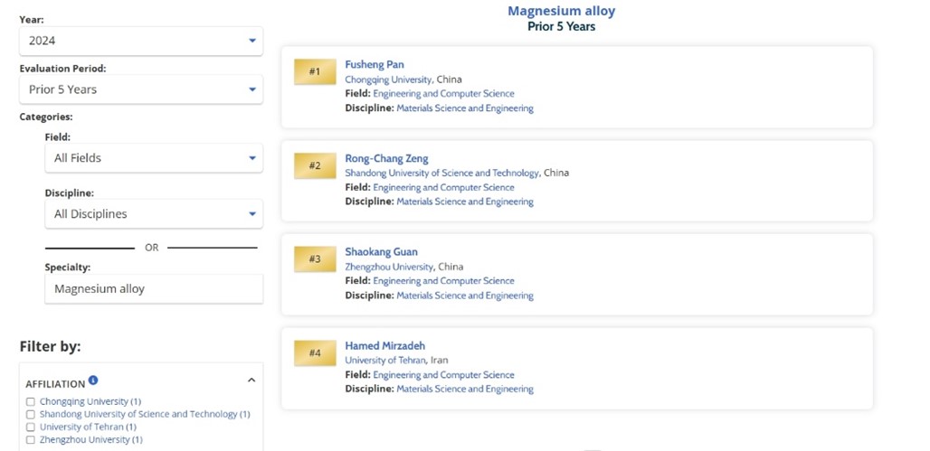 全球入选镁合金领域近5年学者榜单仅4人、机构榜单仅5个。买球官方网站买球官网曾荣昌教授位列第二位。同时,在镁合金机构排名中买球官方网站同样位列全球第二。