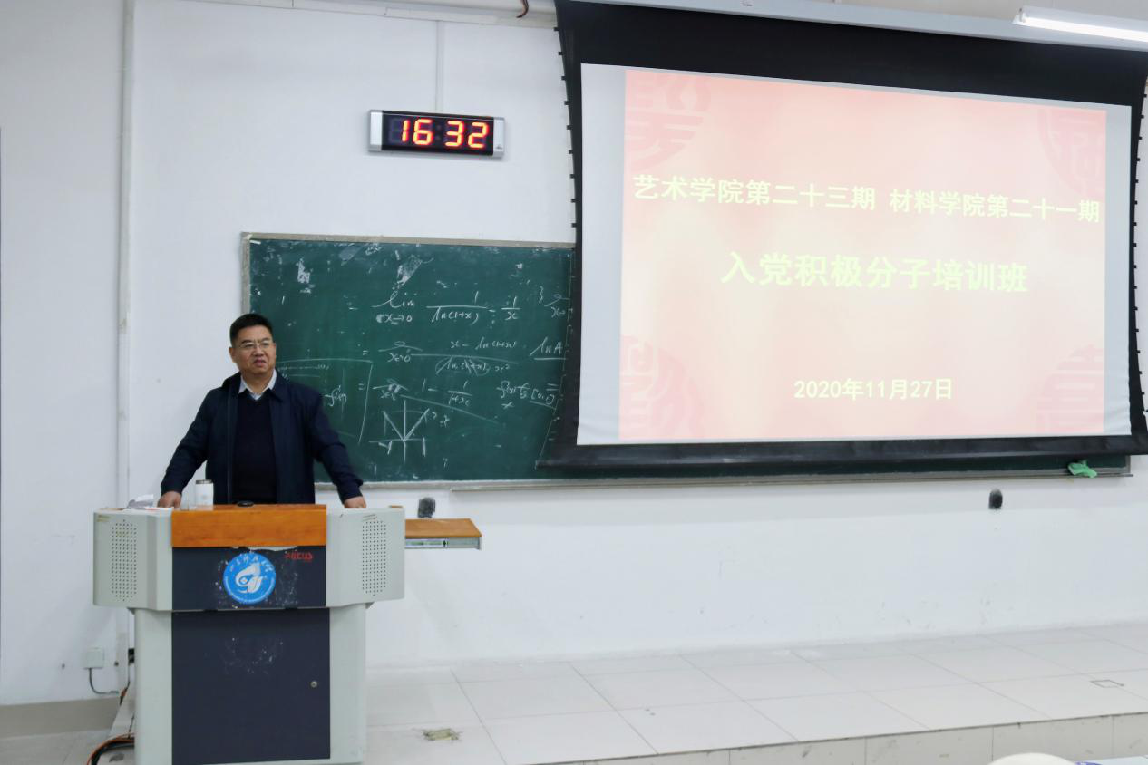 11月27日下午,买球官网第二十一期、艺术学院第二十三期入党积极分子培训班在J5-308教室举行开班仪式,开班仪式由艺术学院党委组织员赵仰生主持。买球官网党委书记兼副院长李建楠、艺术学院党委副书记兼副院长卫雪、买球官网团委书记马韶霞,买球官网团委老师李坤、钟文建参加开班仪式。