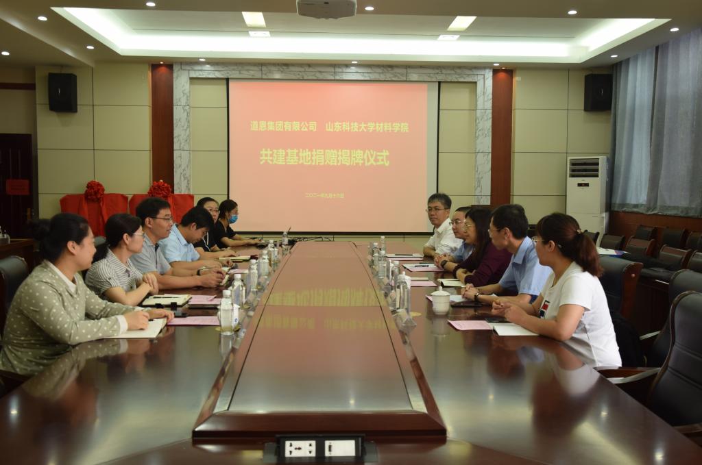 9月16日,买球官网与道恩集团有限公司在J2-434会议室举行了共建“买球官方网站教学实习基地”、“买球官方网站大学生就业创业基地”揭牌仪式暨道恩集团有限公司捐赠仪式。道恩集团人力总监刘丽丽、人力资源部副部长战福东、招聘经理陈健、道恩高分子材料有限公司研发总监王红、道恩青岛新材料公司研发总监张秀文,买球官网党委书记申兆亮、党委副书记兼副院长李建楠、学术副院长韩永芹、团委书记马韶霞、辅导员薄艳艳出席仪式。仪式由韩永芹主持。