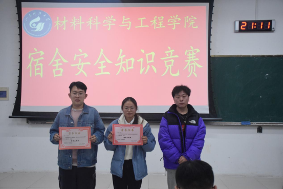 本次比赛分为宿舍安全环保小能手、安全环保小贴士、展示设计作品及观众互动四个环节。比赛现场气氛热烈,观众热情活跃。经过激烈角逐,比赛结果如下:硕士研究生组获得一等奖,金属2021-4、金属2021-3获得二等奖,金属2021-1、高分子2021-1、新能源2021-2获得三等奖,金属2021-2、高分子2021-2、高分子2021-2、材化2021-1、材化2021-2获得优秀奖,金属2021-1、金属2021-2获得精神文明奖。