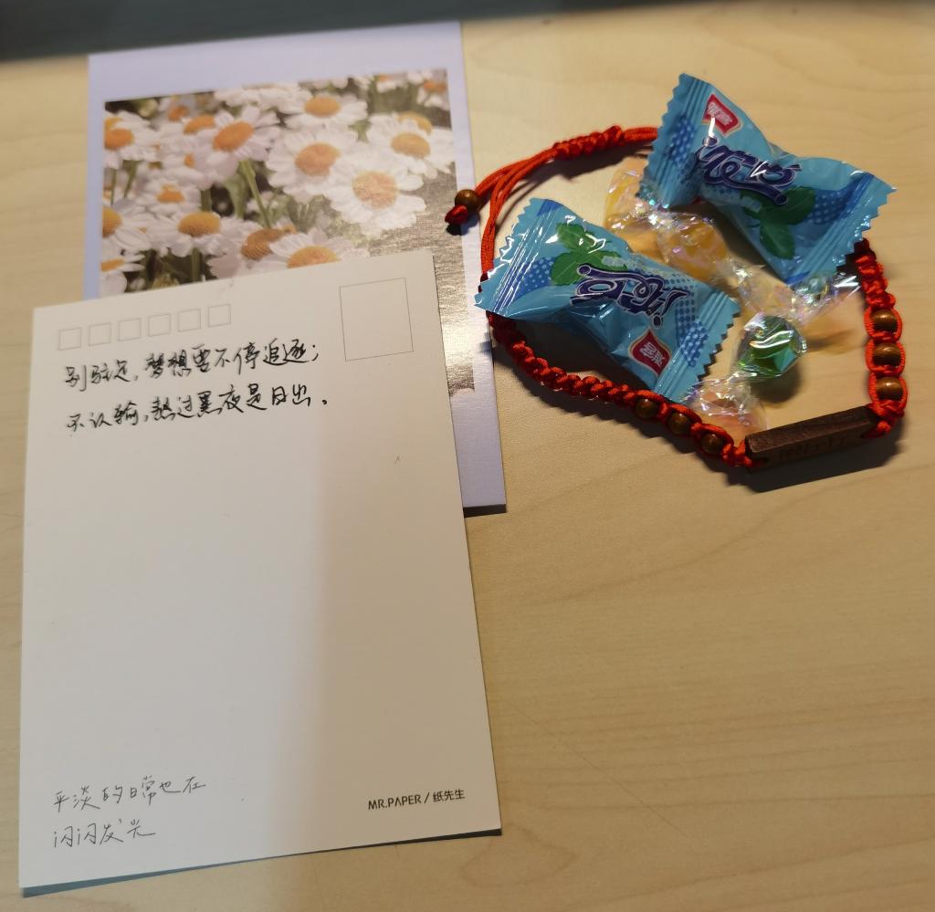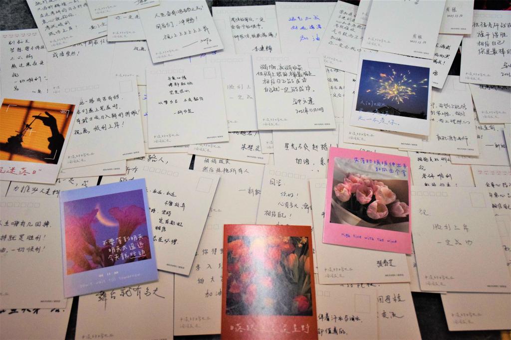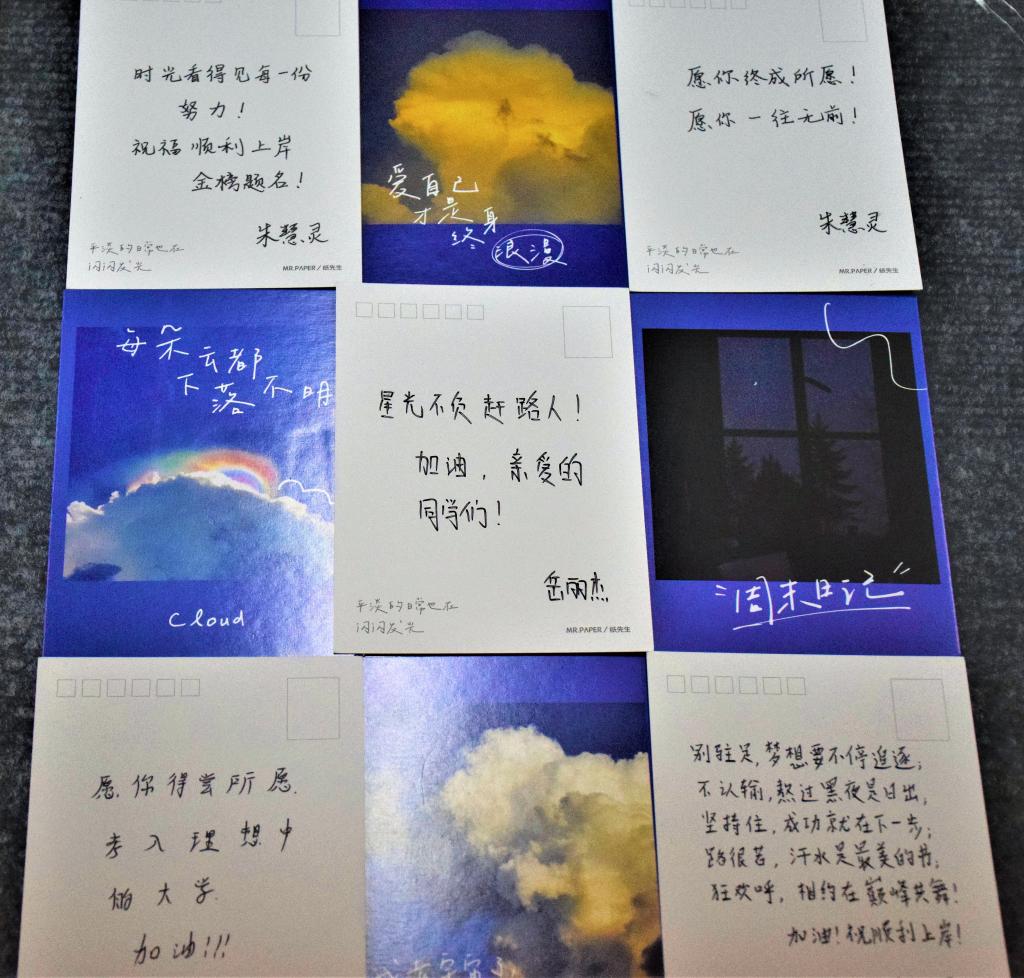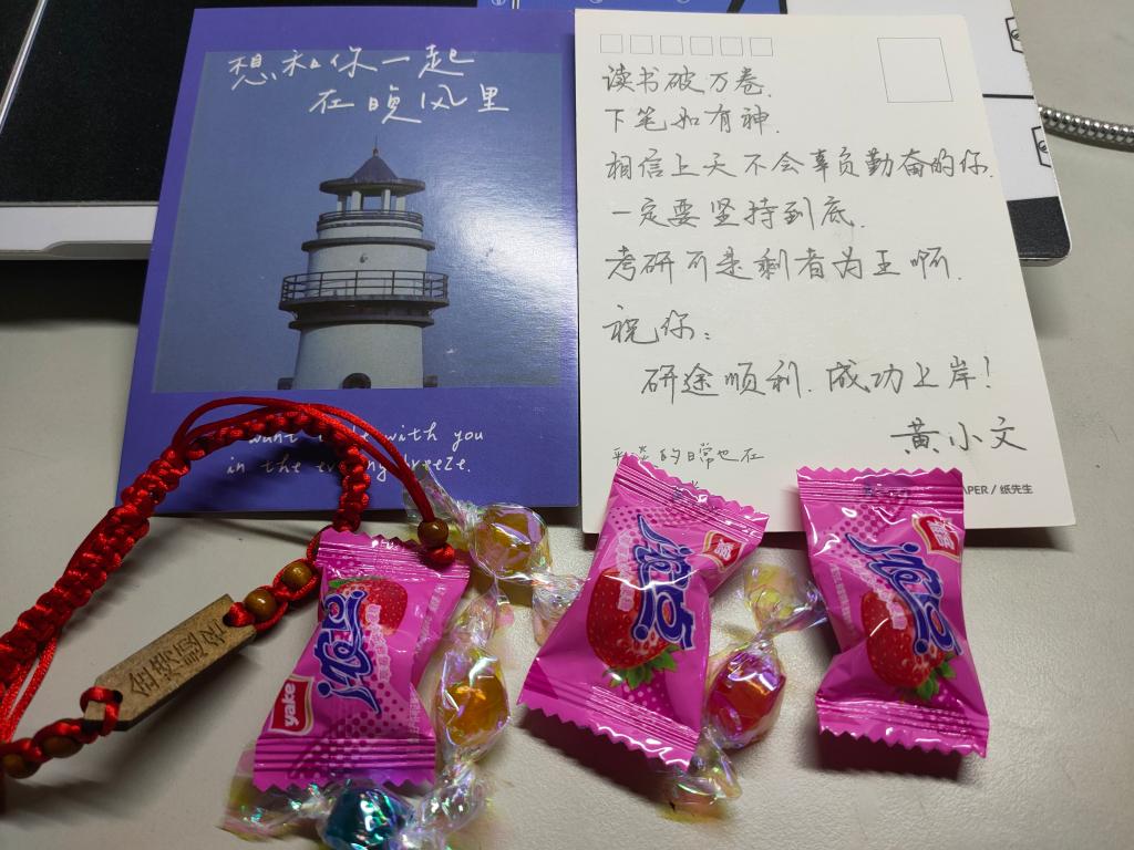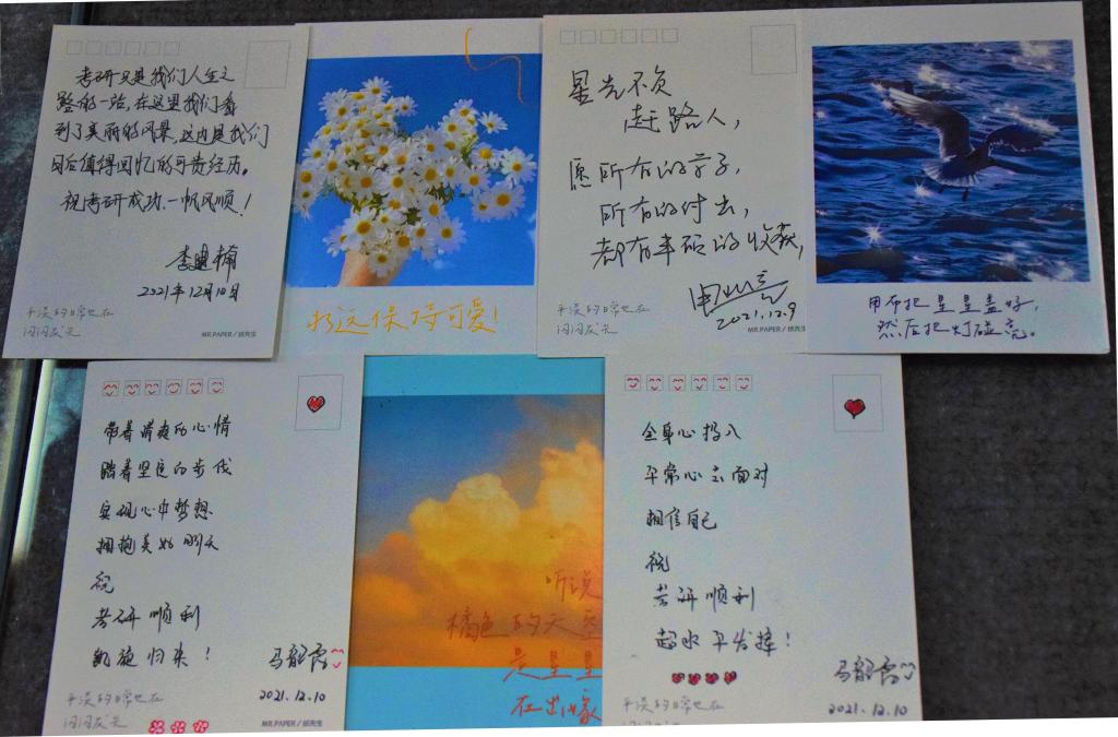 “星光不负赶路人,愿所有的学子,所有的付出,都有丰硕的收获!”“别驻足,梦想要不停追逐;不认输,熬过黑夜是日出”...一句句心里话,一张张明信片,流露着学院老师们对考研学子的殷殷祝福和深深关切。而同学们在写下祝福的同时,还连同糖果一起装进信封,并亲手将这份暖心祝福送达考研同学的手中。正在备考的同学们纷纷表示这份温暖的祝福帮助自己增强了勇气和决心。